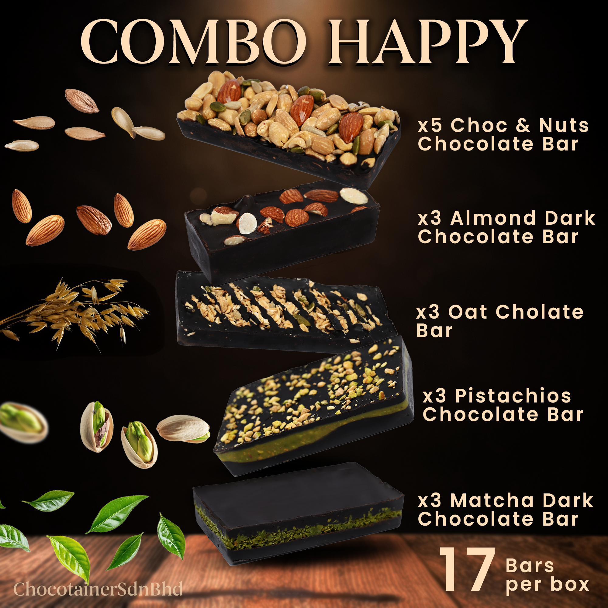 A joyful assortment of five premium dark chocolate varieties: Choc & Nuts, almond dark chocolate, oat chocolate, matcha dark chocolate, and pistachio dark chocolate with rice cereal. Each bar is crafted with high-quality ingredients to deliver rich, satisfying flavor and mindful indulgence.